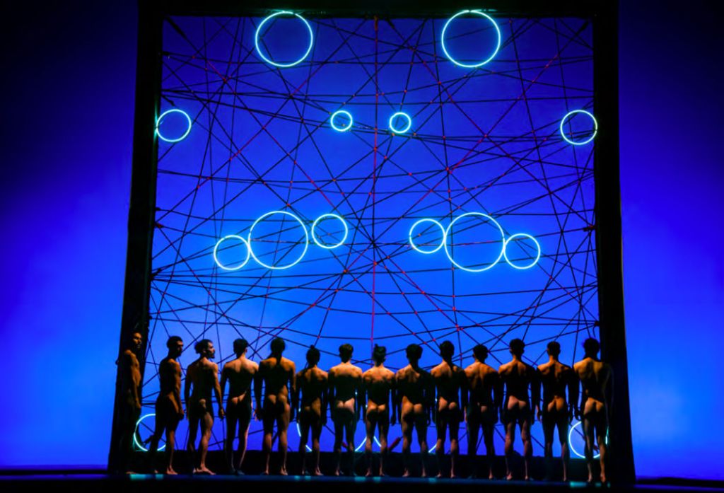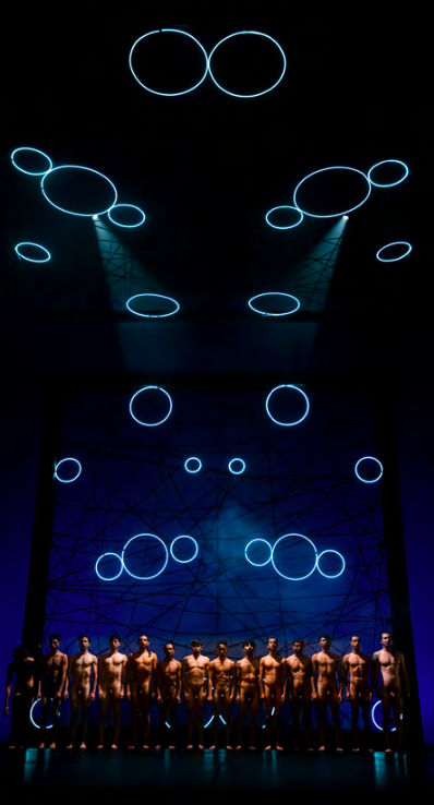 Este despliegue de cuerpos modulares que van desdoblando el espacio, para después extenderse a todo el ancho del proscenio, comienza después a fragmentarse, otra vez lentamente, hacia la profundidad del escenario que descubre su atmósfera azul, generando un contraste cromático con los diferentes tonos de piel. A pesar de sus diferencias, se unifican en lo que parece una línea monocroma de cuerpos que exhiben con todo detalle sus brazos, piernas y culos. Sus tatuajes.