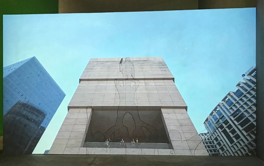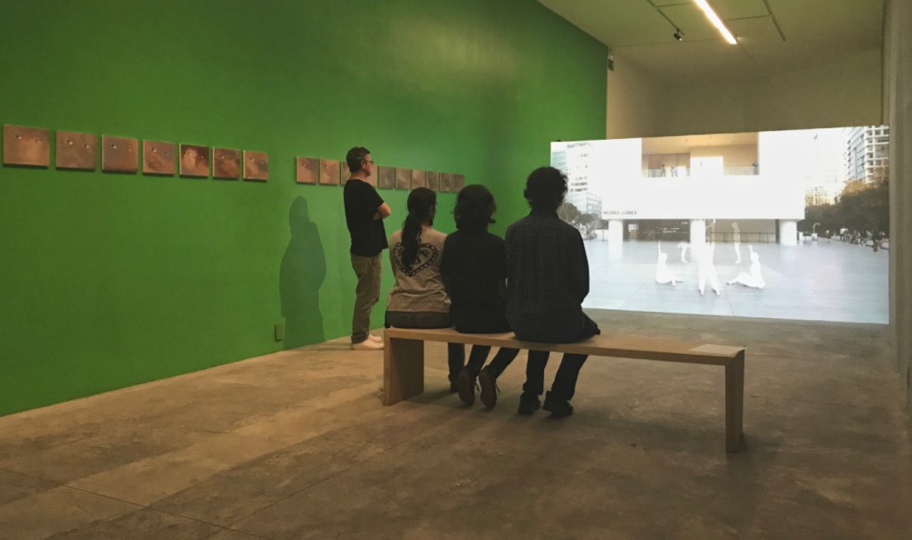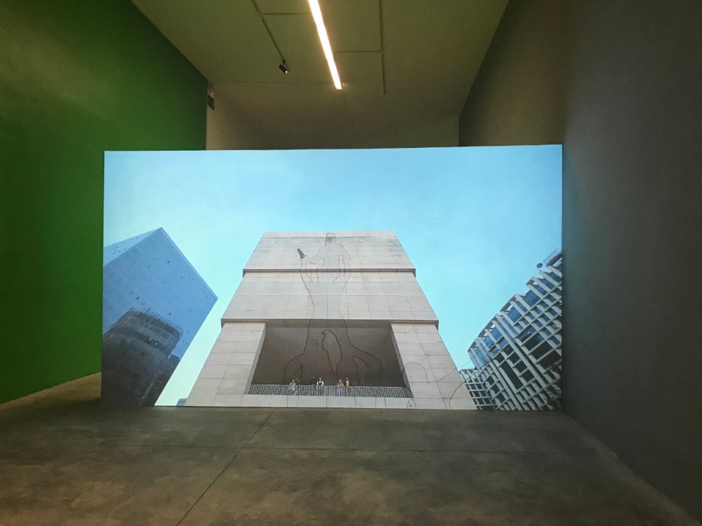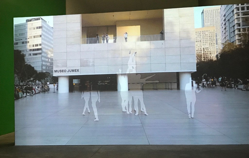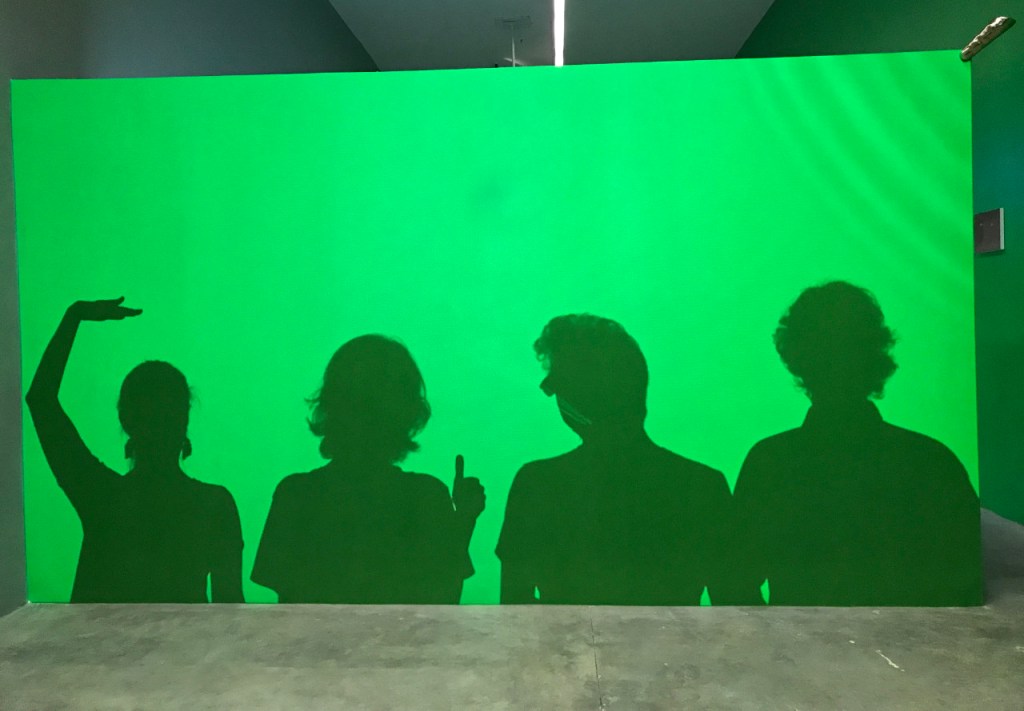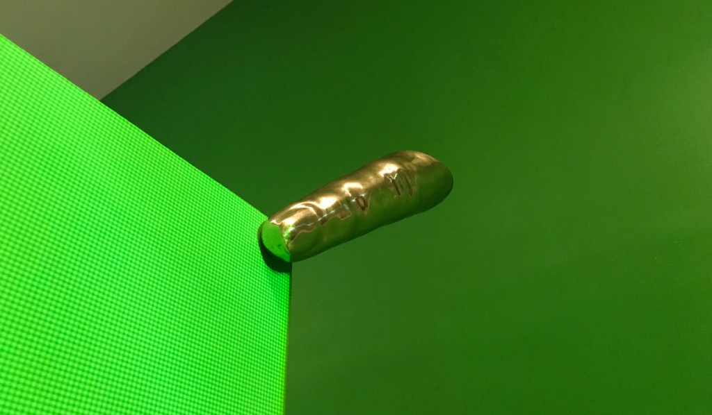 Al ingresar inmediatamente se proyecta la sombra propia en un muro iluminado que muestra el cuadriculado particular de los cañones proyectores. La primera parte de la exposición es pura participación y auto-percepción (también propiocepción). El dedo en la pantalla aparece después, arriba y a la derecha de la mampara, desde el cual se notan —apenas— unas ondas leves en el verde de la superficie. Este dedo, parte escultura, parte prop para performance, proviene de un molde realizado para el monumento ecuestre de Ignacio Zaragoza en Monterrey, donde Leo vive, y que tuvo también exposición en el Museo Jumex de CDMX (septiembre 2021 – enero 2022). Al otro lado de este muro hay pinturas y otra proyección, a la cual responde el audio que inunda la sala desde el principio.