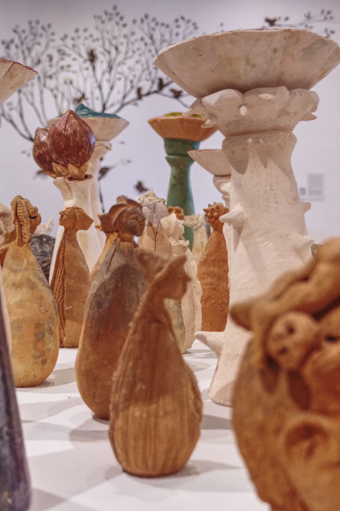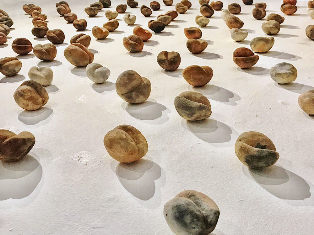 The ceramic set presented brings together a series of material and corporal intersections that link seeds and imaginary flora with women, corn and self-portraits. It is a scenario of germination in which there is no identifiable separation between the plant and the human. In a certain way, it updates the notion –still alive in indigenous peoples– that the body is nature, both perishable and transcendental. It is known that in the original cultures prior to the conquest, agricultural processes were also interpreted in a corporal sense, illustrating numerous moments in the life of people and gods with the stages of the cornfield, the appearance of corn grains with different degrees of ripeness. Its harvest was associated with sacrificial narratives; collecting corncobs in the field corresponded to the ceremonial decapitations to which numerous deities were subjected, as can be seen in ancient codices and ceramics.