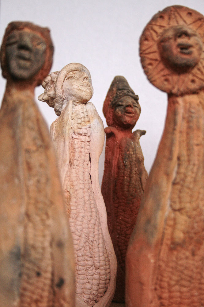 El conjunto cerámico que se presenta reúne una serie de cruces materiales y corporales que vinculan semillas y floras imaginarias con mujeres maíz y autorretratos. Se trata de un escenario de germinación en el que no hay separación identificable entre lo vegetal y lo humano. De cierta forma, actualiza la noción –viva aún en los pueblos originarios– de que el cuerpo es naturaleza a la vez perecedera y trascendental. Se sabe que en las culturas originarias previas a la conquista los procesos agrícolas eran también interpretados en clave corporal, ilustrando numerosos momentos de la vida de las personas y los dioses con los estadios de la milpa, la aparición de los granos del maíz con diferentes grados de maduración. Su cosecha fue asociada a narrativas sacrificiales, recolectar mazorcas en el campo se correspondía con las decapitaciones ceremoniales a las que fueron sometidas numerosas deidades, según se aprecia en antiguos códices y cerámicas.