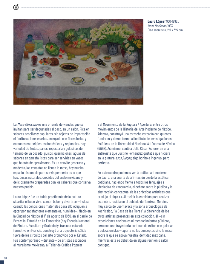 Referencia: Jiménez Abarca, Juan Carlos (2023) Lauro López. Mesa Mexicana. 30. En: Flores Gutiérrez, Rebeca (editora) Colección Residencia Oficial. Complejo Cultural Los Pinos. México: Memórica, Secretaría de Cultura. 50pp