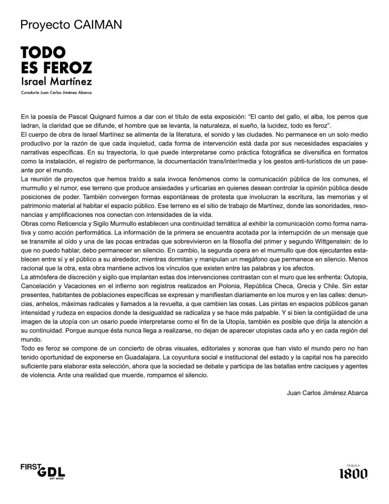 Todo es feroz se compone de un concierto de obras visuales, editoriales y sonoras que han visto el mundo pero no han tenido oportunidad de exponerse en Guadalajara. La coyuntura social e institucional del estado y la capital nos ha parecido suficiente para elaborar esta selección, ahora que la sociedad se debate y participa de las batallas entre caciques y agentes de violencia. Ante una realidad que muerde, rompamos el silencio.