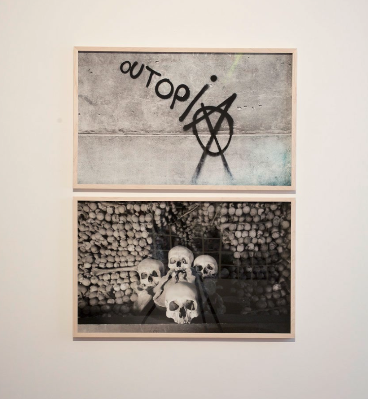 La atmósfera de discreción y sigilo que implantan estas dos intervenciones contrastan con el muro que les enfrenta: Outopia, Cancelación y Vacaciones en el infierno son registros realizados en Polonia, República Checa, Grecia y Chile. Sin estar presentes, habitantes de poblaciones específicas se expresan y manifiestan diariamente en los muros y en las calles: denuncias, anhelos, máximas radicales y llamados a la revuelta, a que cambien las cosas. Las pintas en espacios públicos ganan intensidad y rudeza en espacios donde la desigualdad se radicaliza y se hace más palpable. Y si bien la contigüidad de una imagen de la utopía con un osario puede interpretarse como el fin de la Utopía, también es posible que dirija la atención a su continuidad. Porque aunque ésta nunca llega a realizarse, no dejan de aparecer utopistas cada año y en cada región del mundo.